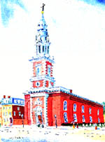 Then in 1992, the church's steeple blew off during a brutal December storm and fell onto the Benjamin Franklin Bridge, closing the span for three days. Miraculously, no one was hurt, but a fifty-foot chasm opened in the church's ceiling and many paintings and murals suffered water damage. In the church's insurance policy, however, the destruction of the steeple and the damaged artwork were considered Acts of God. St. Augustine's used the settlement to repair the steeple and preserve the damaged paintings. Talk about mysterious ways.